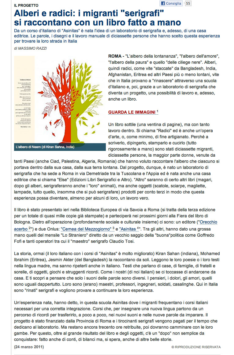 La Repubblica, 24 marzo 2011Alberi e radici: i migranti "serigrafi" si raccontano con un libro fatto a mano di Massimo Razzi